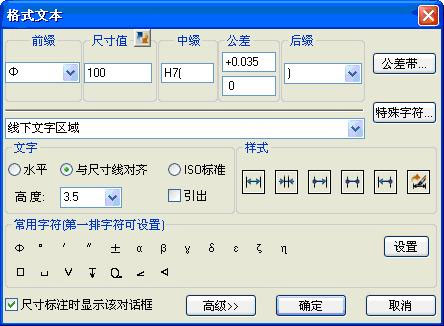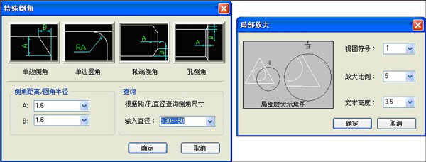 程序提供多种符合国标的常用机械符号标注:焊接符号、粗糙度、锥度、斜度、标高、倒角、形位公差基准、形位公差Ⅱ、向视图、剖切符号。符号形式齐全,双击符号即可弹出标注时的对话框,方便用户修改。