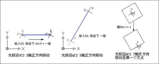 a、 光标沿快速绘图坐标系(QCS)的坐标轴方向移动指定距离,如下图所示;