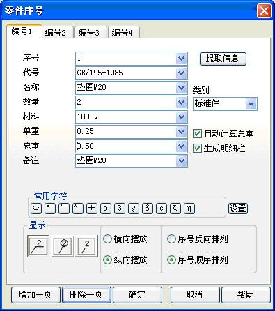 5、序号标注 支持定制符合机械、纺织、汽车等行业标准的序号标注样式。序号标注支持零件和零件组序号标注;能够自动提取出库图形的属性;独创的明细信息记忆功能,成倍地提高了明细表填写的效率。