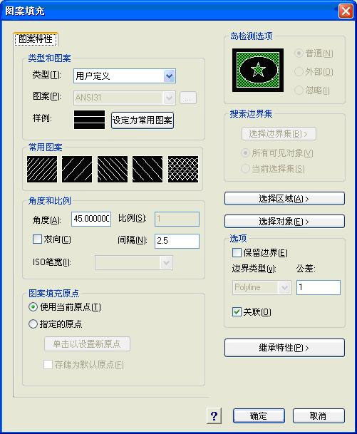 可以将用户绘图经常用到的图案类型及参数设定为常用图案,方便用户填充时直接点击选用,为您有效节省了从众多图案花纹中挑选的时间。程序出厂时,预设了5组机械行业最常用的填充图案,用户也可以根据自己的需要,自由更换预设的常用图案。