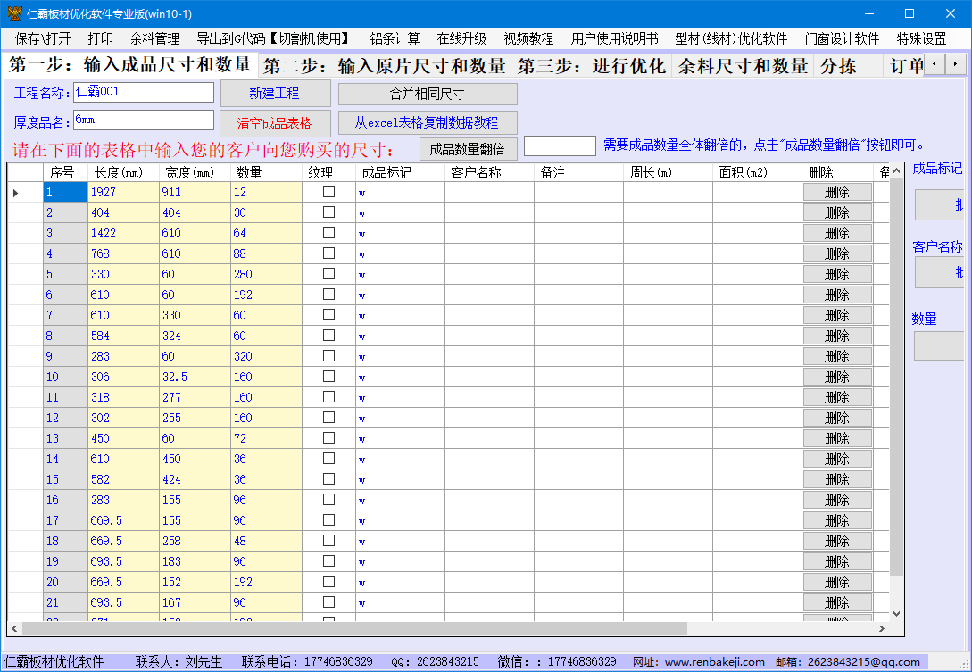 仁霸板材优化软件是一款功能强大,简单实用的切割排版优化的专用软件,主要是针对铝板、不锈钢板、木板、石板等块状物体,是目前市面上优化率最好、速度最快软件。目前,仁霸板材切割排版优化软件支持多种成品(最多500种)和多种玻璃、板材原片同时进行排版,支持2400x1900、2200x1500、2200x1600等不同的原片规格优化,排版完成后可自动计算出可重新利用的余料,并通过导入到余料库存,以备下次优化可以将余料加入计算。