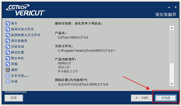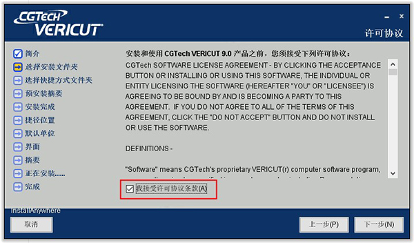 8、一样的,阅读许可服务协议,勾选我接受协议,选择安装位置,默认即可,自行选择是否创建CGTech许可服务的快捷方式,一切准备就绪,点击安装;