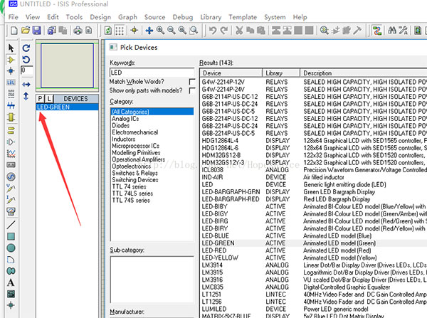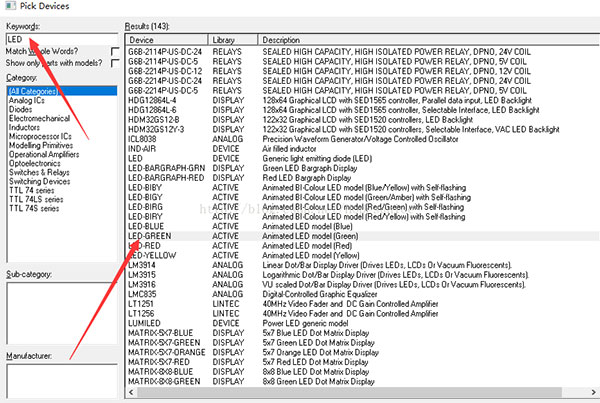点击之后 出现如图所示的界面 在红色箭头的位置即可搜索自己想要的器件 注意 这里搜索输入的关键词基本都是器件的英文简称(其实多数人都是记不住的 我们需要用器件的时候 直接百度这个器件在Proteus中搜索词就行啦 ) 比如 我们搜索二极管 输入LED即可 注意 我们查找的为发光二极管 选择箭头所指的那个 后缀表示其颜色