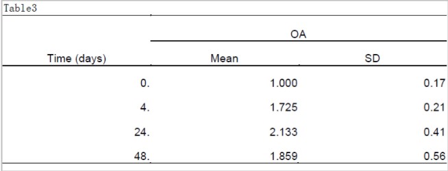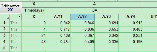 1.1 根据Table1的1组原始数据(4个样本在4个时间点分别测得的OA值)做折线图