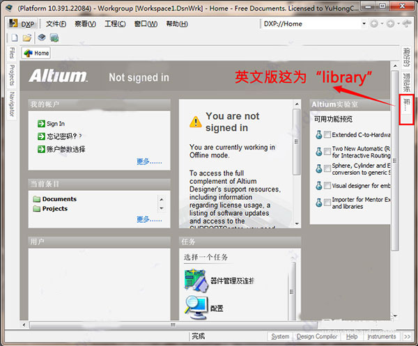 1、打开Altium Designer 16,留意右边侧边栏的”库“,单击: