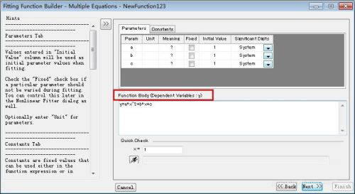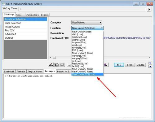 6、回到最初曲线拟合对话框,会发现Function一栏下拉菜单中已经有了创建的方程NewFunction123。
