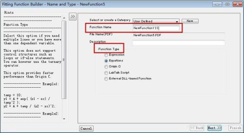 对话框中:Function Name一栏可对方程进行命名(仅限英文),此次命名为“NewFunction123”;Function Type一栏选择第二个“Equations”,然后点击next进行下一步。