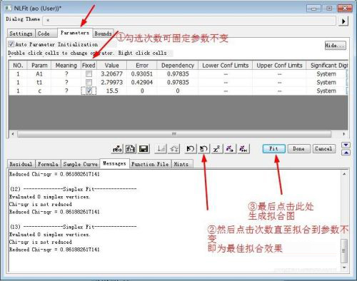 7、然后点击“Parameters”选项卡,勾选Fixed,可固定参数不变;然后点击图示第②步的按钮,进行拟合,直至参数不变,达到拟合最佳效果;最后点击Fit,生成拟合结果。