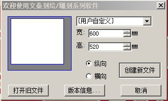 1、打开 文泰刻绘软件 ,然后根据要刻绘的物品选择合适的刻绘尺寸,比如这里选择用户自定义的 600 × 520 尺寸大小,然后点击“创建新文件”。