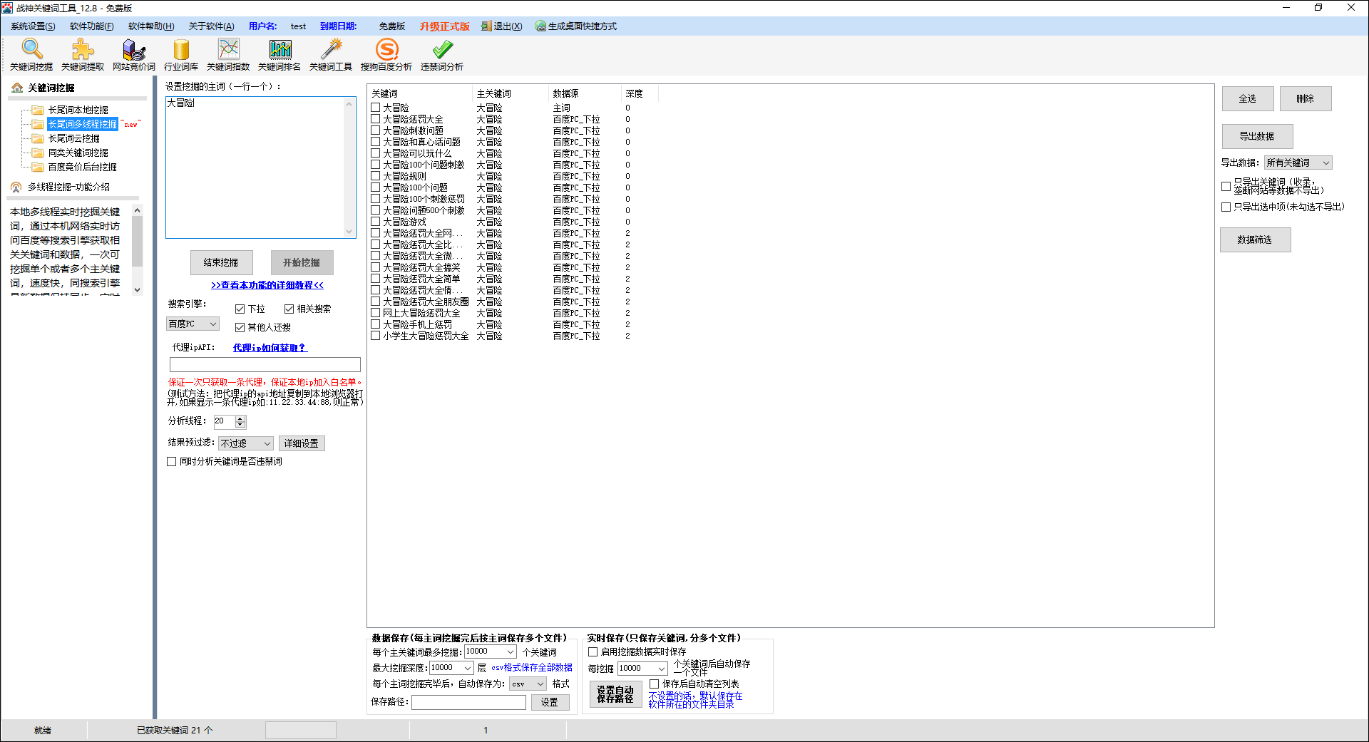 通过战神关键词工具强大的云挖掘或者本地多线程挖掘功能,批量挖掘,轻松获取百万级别的长尾词。