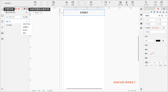 第四:在偏好设置-推荐模式下,页面列表位于工作区的左侧,与元素列表并排,你可以在页面列表下添加新页面、子页面、创建副本、移动当前页到其他项目、删除等操作