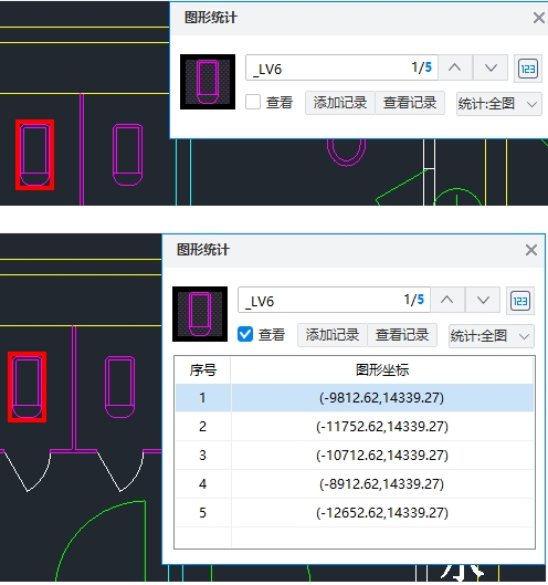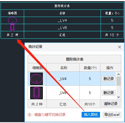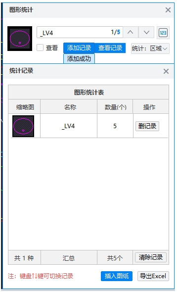 -如果需要记录多个统计结果的时候,点击添加记录,即可将本次统计的结果添加的记录,记录支持删除、插入图纸和导出Excel