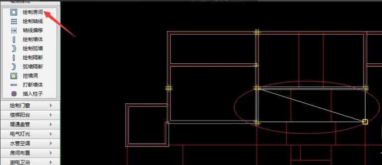 然后选择“绘制墙体”功能,在上图中的轴线上绘制房屋的墙体,自动捕捉轴线,绘制墙体。