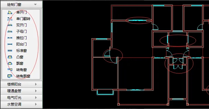 选择图示位置的“绘制门窗”功能,然后在图示位置绘制门窗,按照软件提示进行操作即可,这里一定要依据你的房屋实际尺寸进行绘制。