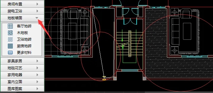 然后就是在房间布置、厨电卫浴、地板墙面、家居家具等功能,进行你想要的装修风格,这里就有自带图库,只需要按照提示添加即可。