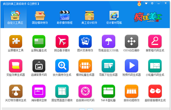 各种模块代码一键生成,你是否经常花1天或者N个小时的时间去传一个首页呢,经常遇到切片问题及各种特效不会安装而让自己的店铺的视觉感…大打折扣。有了疯狂的美工装修助手这一切都可以得到改善!