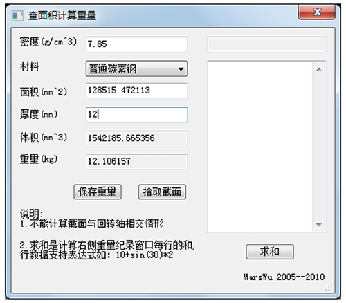 ①点击“二次开发程序集”→“查面积计算重量”,左下角提示“拾取环内点”,单击准备计算的零件图样,选中后右击,弹出一个“重量计算”窗口。窗口中面积自动给出,再输入材料厚度、密度,重量就显示出来。