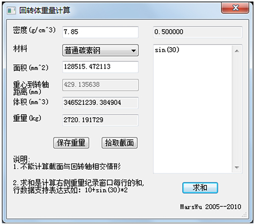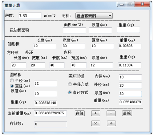 ②点击“二次开发程序集”→“输入数据计算重量”,出现另一种计算重量窗口,类似于一个小型计算器,可对一些规则形状的几何体进行重量计算,如矩形、方环形、圆形和圆环等,只需输入一些给定的尺寸及密度,重量自动得出。