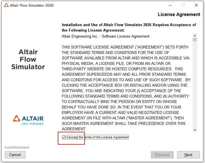 2、双击Altair_FlowSimulator_AU_V2026.exe先安装软件,接受软件协议;