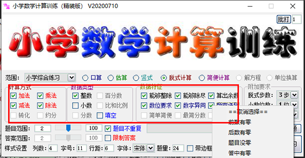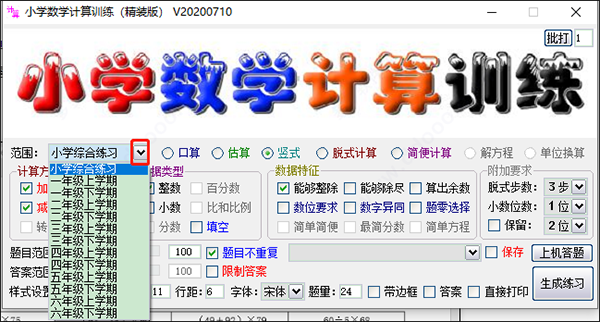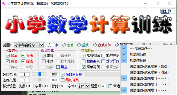 小学数学计算训练精装版是一款简单易用的小学数学计算题生成器,并该版本是作者在2020年全新推出的,不仅是单文件绿色版本能直接打开使用,还可以直接配合Word使用,十分强大。