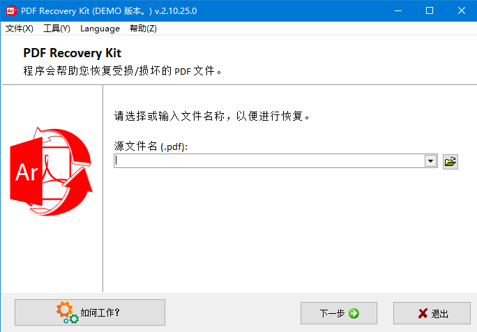 6、中文用户界面,并且使用向导恢复的方式指引用户修复PDF文档。