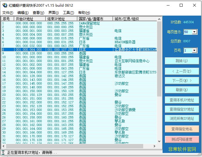 与同类软件相比,红蜻蜓IP查询快手更加简单,并且完全免费,提供上下翻页,指定页号跳转,可随时设置每页显示的记录数;能够导出IP地址分配记录到CSV文件或Access 2000 数据库(*.mdb);能够获取上网机器IP地址及所在地址位置;提供指定IP地址查询功能,用户只要输入一个IP地址即可查询到该IP地址已被分配给的国家/地区/城市/组织等信息,并可以测试网络速度,对于网络管理人员来讲,还是很实用的,有需要的可以下载收藏。