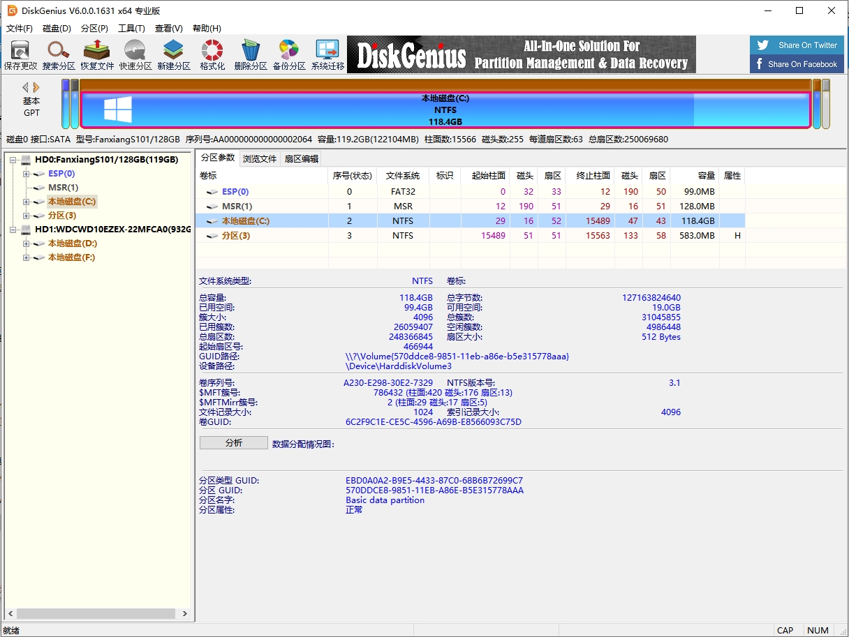 打开diskgenius后,在软件中可以看到电脑中的所有磁盘及分区。软件主界面看似复杂,其实很有条理,用户可以很容易找到丢失数据的盘;