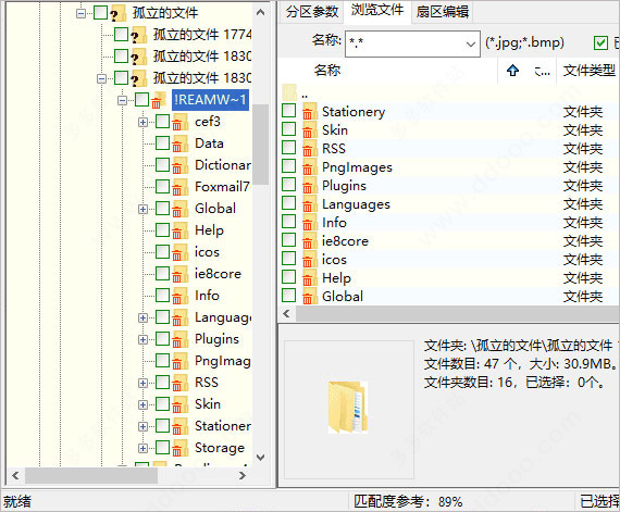 搜索完成后,恢复文件对话框自动关闭。程序主界面将显示搜索到的文件,每个丢失的文件或文件夹前面都有一个复选框,左侧的文件夹层次图中的条目也加上了复选框。见下图。