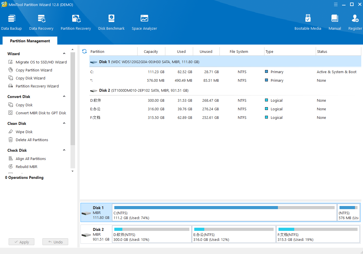 现如今人手一台电脑,那么对于怎么磁盘分区、硬盘分区、新硬盘如何分区、dell硬盘分区,我们的硬盘到底分几个区最好,硬盘分区有什么用?无论您是新手还是老鸟,minitool partition wizard 12都可以将为您轻松解答,这是一款无损数据的分区管理工具,又叫做minitool分区向导12,该软件界面的功能非常多,大部分都是针对分区管理来进行开发,软件可以在无损数据的基础上完成调整分区大小、移动分区、快速分区、复制磁盘、扩展分区、分割分区、恢复分区、迁移系统到SSD/HD等操作,并且支持Windows XP/Vista/7/8/10等系统环境,是你电脑分区的好帮手。