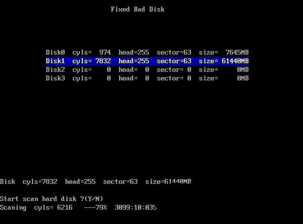 2、按“Y”键开始进行扫描,扫描过程中如遇到坏道时,程序会自动显示出坏道所在位置。