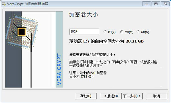6、弹出加密卷大小窗口,在这里我们输入1024,然后选中kb单位,意思是创建1GB大小的文件加密卷,然后点下一步,如下图所示: