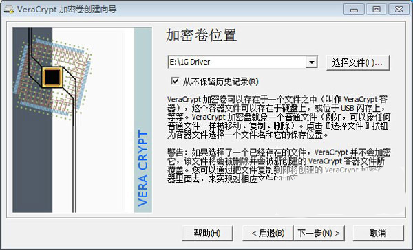 4、弹出加密卷存储位置,我在这里把它保存在e:盘,取名为"1G Driver",在加密卷位置栏输入e:\1G Driver,当然你也可以选择文件。然后点下一步,如下图所示: