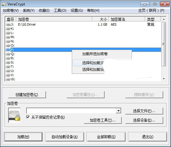 1、运行veracrypt,在主窗口的虚拟盘符上单击,然后右键点击“选择和加载文件”菜单,这里我选择P盘符,如下图所示:
