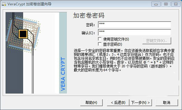 7、弹出加密卷密码输入窗口,这里是输入加密卷的密码,用来保护你的加密卷数据,在加载加密卷需要用到,密码建议6-20位密码,然后点下一步,如下图所示: