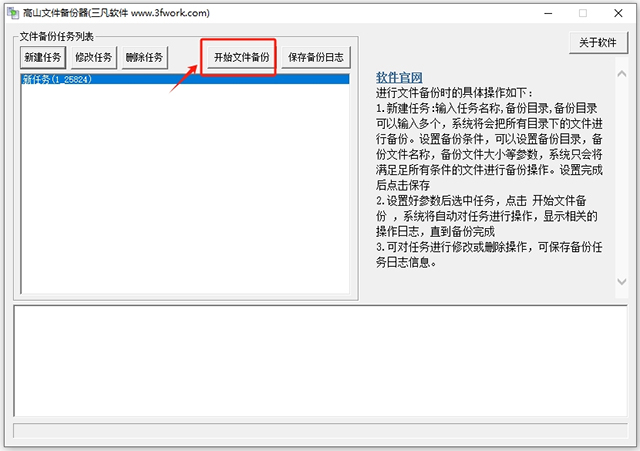2、设置好参数后选中任务,点击“开始文件备份”,系统将自动对任务进行操作,显示相关的操作日志,直到备份完成