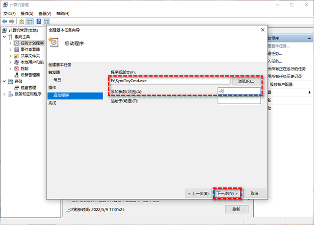 10、单击“浏览”按钮以查找您Synctoy的软件安装目录,在其中找到并点击SyncToyCmd.exe,然后在下方添加参数一栏中输入-R以实现每次执行全部同步任务。