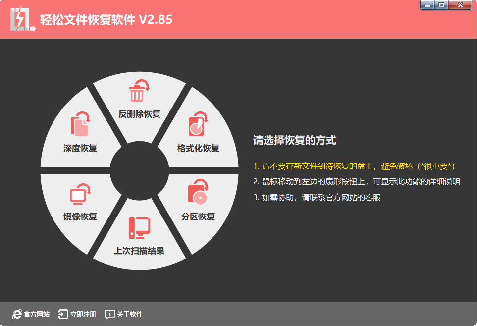 轻松文件恢复软件官方版是用户最好的文件恢复专家,也是目前小编用过的最好的高性能的硬盘文件恢复软件,采用优秀的数据扫描引擎,从磁盘底层读出原始的扇区数据,经过高级的数据分析算法,把丢失的目录和文件在内存中重建出原分区和原来的目录结构,数据恢复的效果非常好。