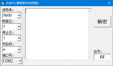 永宏plc解密软件是一款功能强大的plc解密工具,软件界面友好,功能强大,可以帮助用户对设备解密,如果你需要知道设备密码就可以通过这款软件查看,有时候在维护设备的时候需要知道设备超级密码,如果您不知道厂家设置的密码可能就无法维护设备,通过这款解密软件就可以查看设备的原始密码,从而让您可以正常对设备的系统参数修改,适合PLC设备维护人员使用。此外该软件还能直接读取永宏plc程序密码和程序id,不影响plc程序,可解永宏FB、FBA、FBN、FBE、包括ID密码,FBS系列可解部分型号,有的无法破解,软件为试用版。