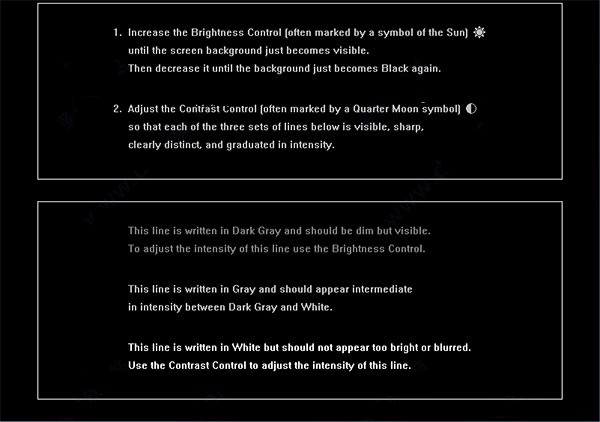 ②如果白色刚好可以辨别,那么最高强度已被设置得太高,显示器的白色已经饱和了。