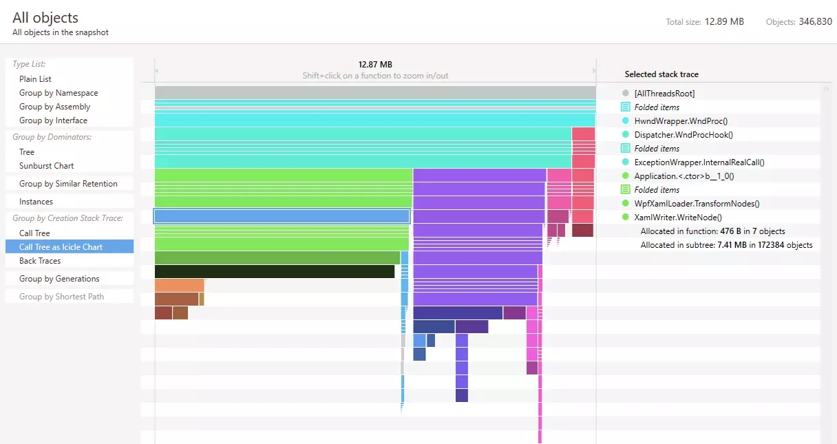 我们还重新实现了对象集的 Back Traces(反向跟踪)视图。 视图中的倒置调用树显示了从创建特定对象集的函数开始,从下到上的调用链。