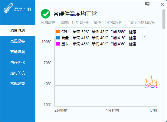 温度监测软件是一款功能强大、实用性高的电脑温度检测工具,不仅能够帮助用户实时监测电脑各个组件的温度,预警防止过热导致的硬件损坏,还提供了节能降温和内存优化功能,让用户的电脑轻松保持最佳状态,性能更稳定,使用更安心。