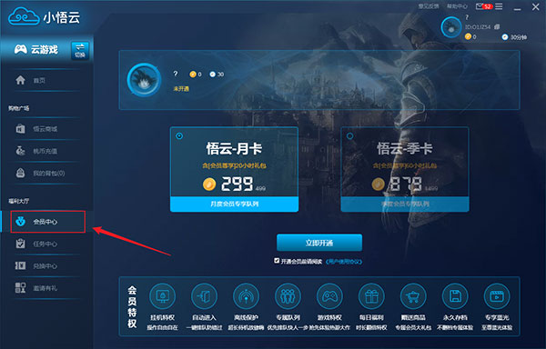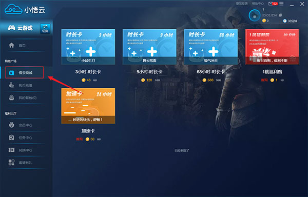 2、【悟云商城】,在商城里面可以购买时长卡和加速卡等。