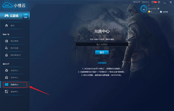 7、【兑换中心】,在里面输入兑换码即可获取游戏时长奖励。