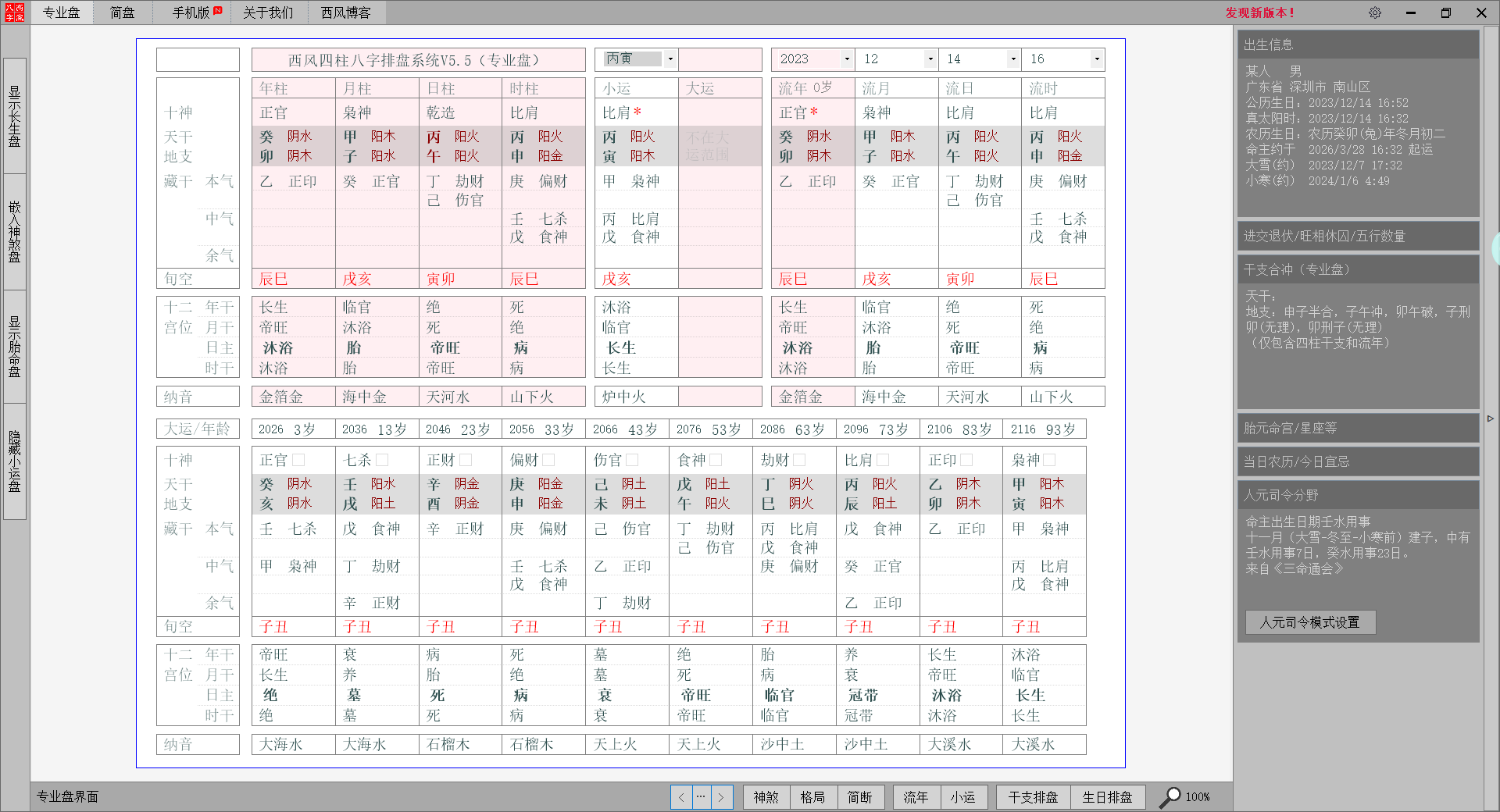 专业盘面,相较其他软件不仅包含了年、月、日、时、大运、流年的排盘,也包括了小运、流月、流日、流时、命宫、胎元的排盘。