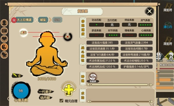 第二种方法,带加心境的符咒,在一本叫三洞玉函的书里可以学会画这种符的方法。圣品心境符百分百品质(我开了mod)能加50.50的心境。这也是神修必须要的东西。