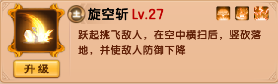 挑飞敌人后下劈,最后一段下劈到的敌人会被减少防御(最高可减少敌人2100左右的防御),中途可用跳跃打断。这是一个偏向于增益型的技能,二转之前的神技,在释放无双之前使用旋空斩可以大幅度提升无双的伤害,个人认为不太适合当成一直释放用作打伤害的技能。加点建议:一直都点满。