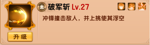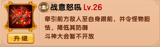 牵引前方敌人至自身跟前,并令怪物胆怯,降低其防御,无视霸体,比如满条的牛金牛可以直接用战意怒吼吸过来。也可打断很多技能,比如正在使用玄弥之风的汉钟离。降低敌人防御,当前版本最高可减少敌人4800左右的防御。点满!点满!点满!(重要的事情说三遍)战意怒吼这个buff可以说是二转最强buff之一,我的建议是直接点满,不用一直续着,在无双之前用就可以,持续时间和cd都是固定的十秒,技能等级的提升只有减少防御的数值。怒吼的范围不是全屏,但是可以占据屏幕的四分之三左右,所以使用的时候要计算好距离。