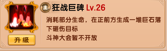 消耗部分生命,在正前方生成一堆巨石落下砸伤目标。需要消耗固定值生命才能释放的技能,蓝耗比其他角色二转大招蓝耗低一个等级,天降石碑,简单粗暴。天上的飞行怪物会被击落,如果下面没有平台,飞行怪物会下坠下去,只能吃到一段石碑。加点建议:刚二转时如果属性不是很好,可以选择先不带石碑,用双破防无双流打法。三万蓝时可点到20级,六万蓝左右可以点满(也可按自己舒服的加点来)。