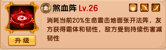 消耗当前20%生命震击地面张开法阵,友方获得霸体和韧性,敌方受到持续伤害减韧性。最高可增加3473韧性,但是对敌方减韧的数值不知道怎么计算,如有大佬知道可以评论里告知(感谢)。煞血阵最大的作用是压血增加被动,新手猛攻可以不带煞血阵,二转之前也可以不用煞血阵。煞血阵的持续时间和cd都是十秒固定不变,技能升级会增加伤害和加减韧性,不会改变cd和持续时长。加点建议:前期1级不变,前期可带可不带,技术好可以带着压血,技术不好就换成狂沙吼。后期酌情往上加点,蓝量足够多的话可以点满去减敌人韧性。