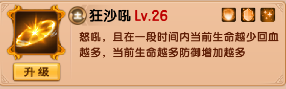 怒吼一声对周围敌人造成僵直,并且在一段时间内当前生命越少回血越多,当前生命越多防御增加越多。狂沙吼是猛攻的回血续航技能,在自身血量低时拥有不俗的回血量,在自身血量高时使用也会给自己增伤高额防御(最高可达9680防御)。新手猛攻玩家如果对血量把控不好的话可以在使用无双之后接个狂沙吼防止暴毙,建议加点:一直点满。
